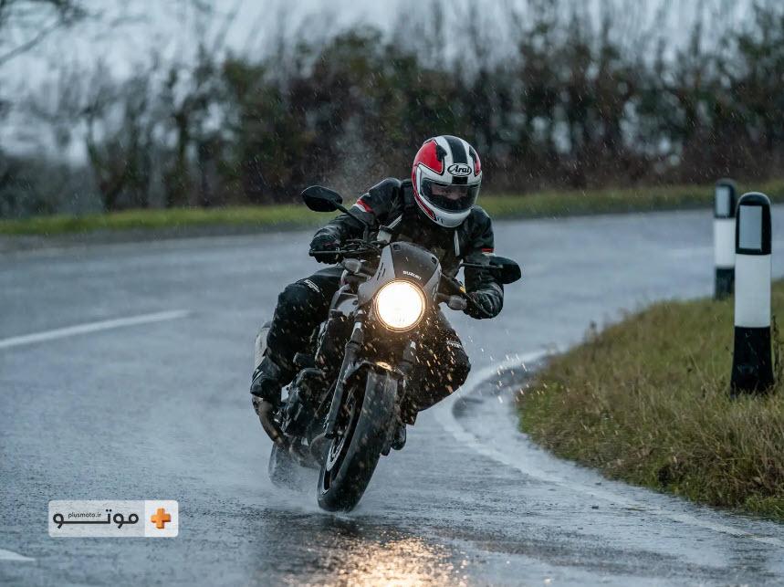 واضح تین چیز این است که بدن شما خیس میشود. جاده زیر پای شما نیز خیس شده و همین، عاملی میشود برای اینکه نیروی کششی بین لاستیک و آسفالت، بسیار پایین بیاید. درواقع در زمانهای خشک و غیر بارانی سال، سطح جادهها، روغنها و مواد دیگر را به خود جذب کرده و در مواقعی که باران میآید و سطح جاده خیس میشود، این مواد دوباره به سمت سطح جاده، میرسند. خطرناکترین زمان برای رانندگی با موتور، در ساعت اولیه یک باران شدید است؛ یعنی زمانی که همهی این مواد زائد و روغنها، به سطح جاده رسیدهاند و هنوز شسته نشدهاند.